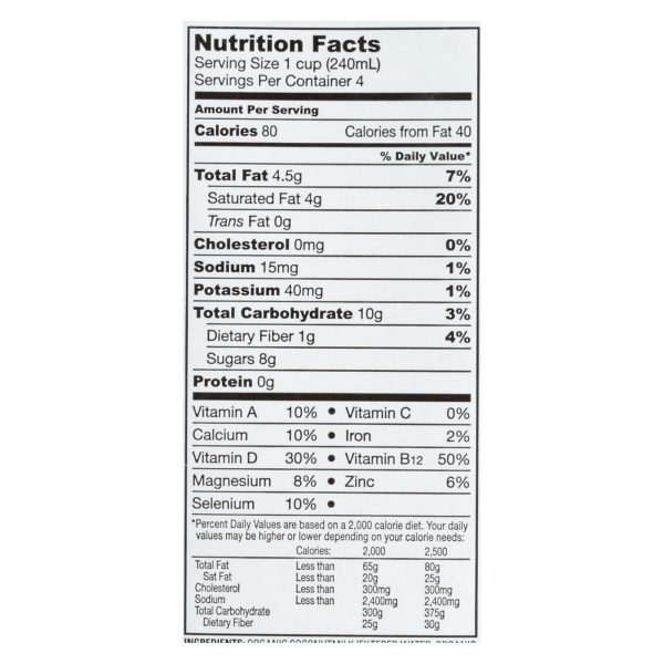 ingredients : organic coconutmilk (filtered water, organic coconut cream);organic cane sugar;organic guar gum;vitamin and mineral blend (calcium phosphate, magnesium phosphate, calcium carbonate, l-selenomethionine [selenium], vitamin a acetate, vitamin d2, zinc oxide, vitamin b12);natural flavor;xanthan gum