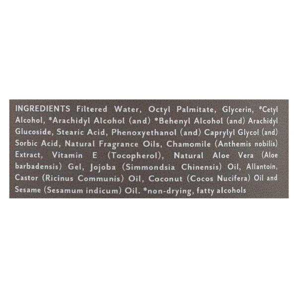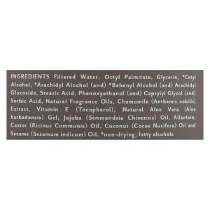 ingredients : filtered water;octyl palmitate;glycerin;cetyl alcohol;arachidyl alcohol;and;behenyl alcohol;arachidyl glucoside;stearic acid;phenoxyethanol;caprylyl glycol;sorbic acid;natural fragrance oils;chamomile;anthemis nobilis;extract;vitamin e;tocopherol;natural aloe vera;aloe barbadensis;gel;jojoba;simmondsia chinensis;oil;allantoin;castor;ricinus communis;coconut;cocos nucifera;oil and sesame;sesamum indicum