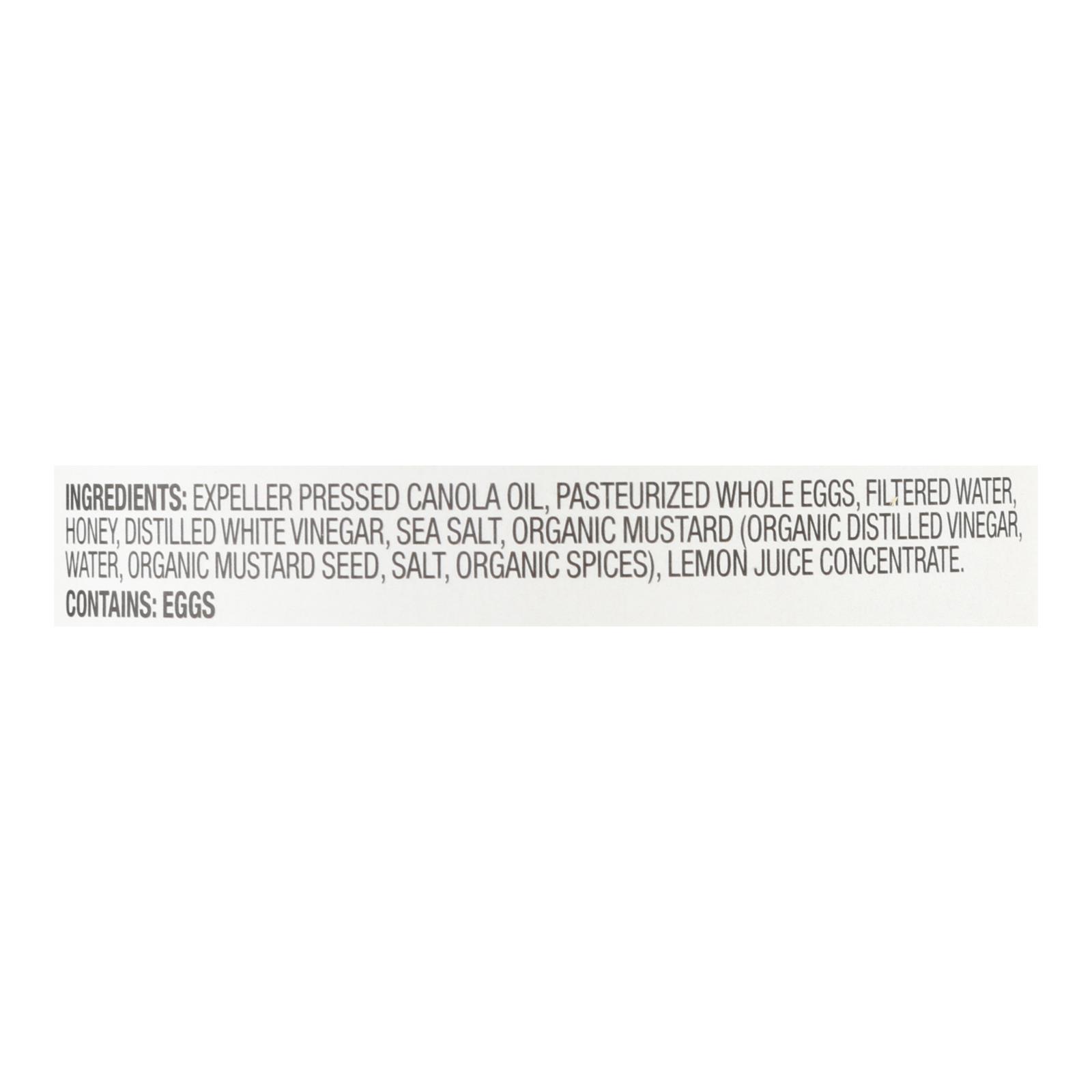 ingredients : expeller pressed canola oil;pasteurized whole eggs;filtered water;honey;distilled white vinegar;sea salt;organic mustard (organic distilled vinegar, water, organic mustard seed, salt, organic spices);lemon juice concentrate