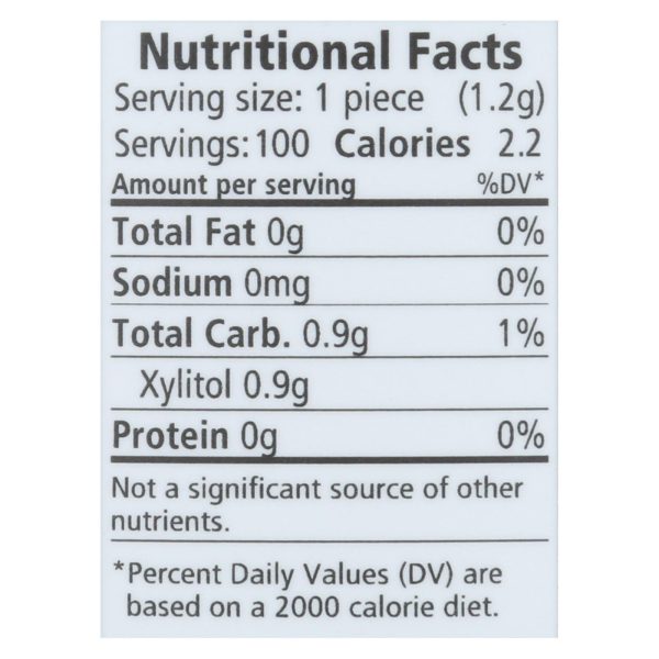 Spry sugarfree fresh fruit chewing gum is made with ingredients like xylitol, gum base, natural flavors, gum arabic, calcium carbonate, malic acid, vegetable glycerin, soy lecithin and carnauba wax. Each 100 count box has 100 servings of 1 piece each. Each serving has 1.7 calories. Our chewing gum is vegan, non-gmo and gluten-free.