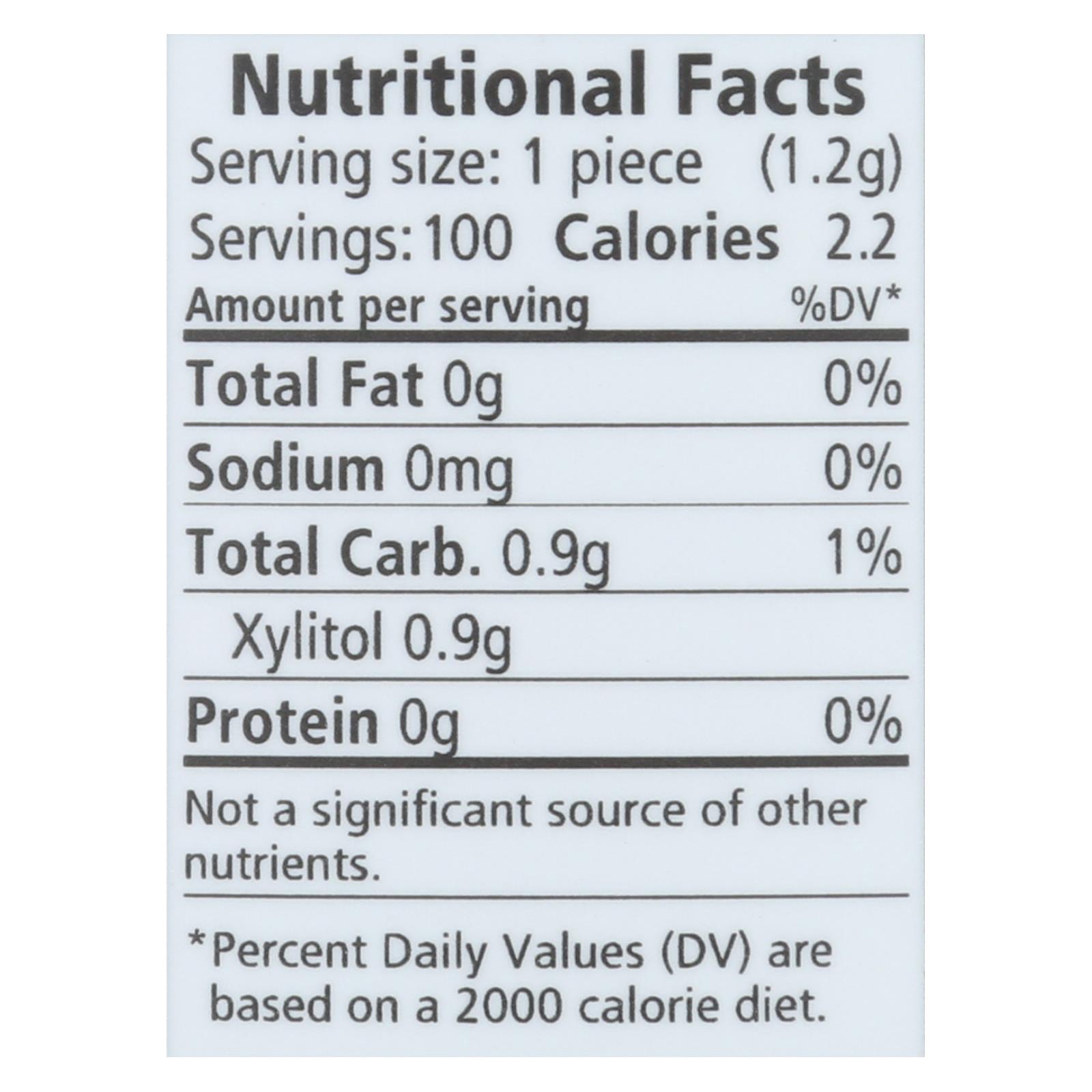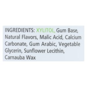 ingredients : xylitol;gum base;natural flavors;malic acid;calcium carbonate;gum arabic;vegetable glycerin;sunflower lecithin;carnauba wax