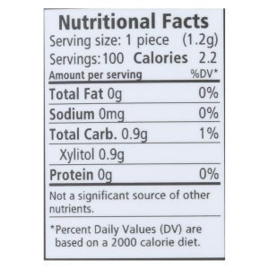 Spry sugarfree peppermint chewing gum is made with xylitol, gum base, peppermint oil, vegetable glycerin, gum arabic, non-gmo soy lecithin, calcium carbonate and carnauba wax. Each 100 count box has 100 servings of 1 piece each. Each serving has 1.7 calories. Our gum is gluten-free, kosher and non-gmo.