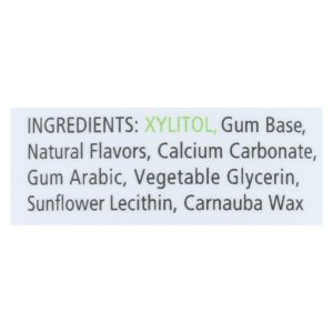 ingredients : xylitol;gum base;natural flavors;calcium carbonate;gum arabic;vegetable glycerin;sunflower lecithin;carnauba wax