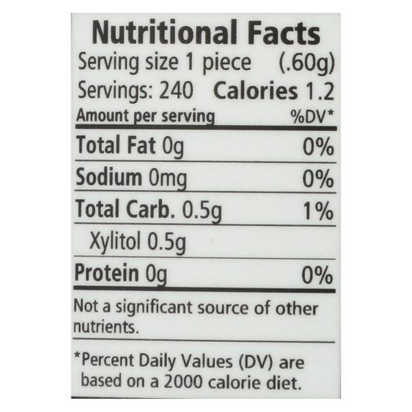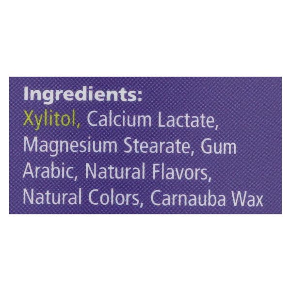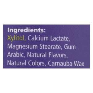 ingredients : xylitol;calcium lactate;magnesium stearate;gum arabic;natural flavors;natural colors;carnauba wax