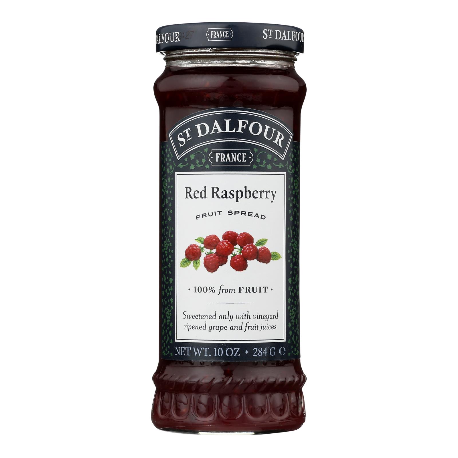 St. Dalfour’s red raspberry fruit spread is made with ingredients like red raspberries, fruit juice concentrates, fruit pectin and lemon juice. Each 10 oz. Jar contains 12 servings of about 1 tbsp. Each. Each serving of our fruit spread has 50 calories. Our delicious fruit spread is made in france by an old recipe.