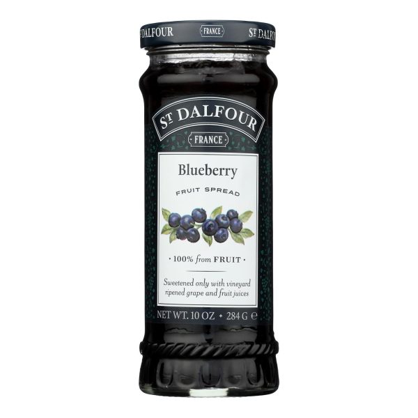St. Dalfour wild blueberry fruit spread is made with blueberries, fruit juice concentrates, fruit pectin and lemon juice. Each 10 oz. Jar contains 12 servings of about 1 tbsp. Each. Each serving of our blueberry fruit spread has 50 calories. Our delicious fruit spread is made in france and does not contain artificial colors or flavors.