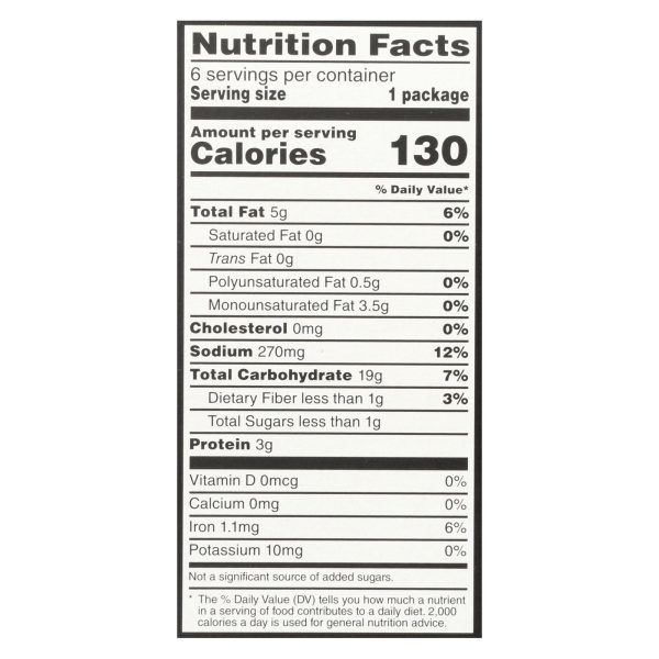 Stacy’s sea salt pita chips have 0 g. Of trans fat per serving for a health-conscious snack. We don’t use any artificial colors or flavors to keep the taste pure. Each of these 6 bags is kosher to accommodate people of this dietary restriction. One bag is a single serving with 130 calories. See nutrition facts panel for allergens.