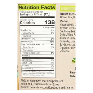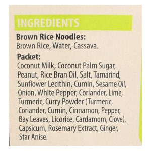 ingredients : brown rice noodles: brown rice;water;cassava;packet: coconut milk;coconut palm sugar;peanut;rice bran oil;salt;tamarind;sunflower lecithin;cumin;sesame oil;onion;white pepper;coriander;lime;turmeric;curry powder;cinnamon;pepper;bay leaves;licorice;cardamom;clove;capsicum;rosemary extract;ginger;star anise