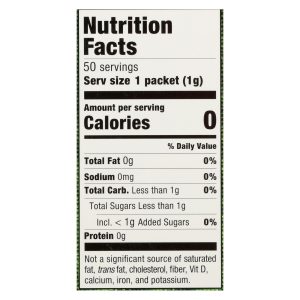In the raw stevia sweetener is gluten-free, kosher and vegan, so it can be enjoyed by people with any of these dietary restrictions. Each single serving packet in our box of 50 contains zero calories, so you won’t feel guilty about using it. Since our sweetener contains less than 1 g. Of sugar, it is diabetic friendly.