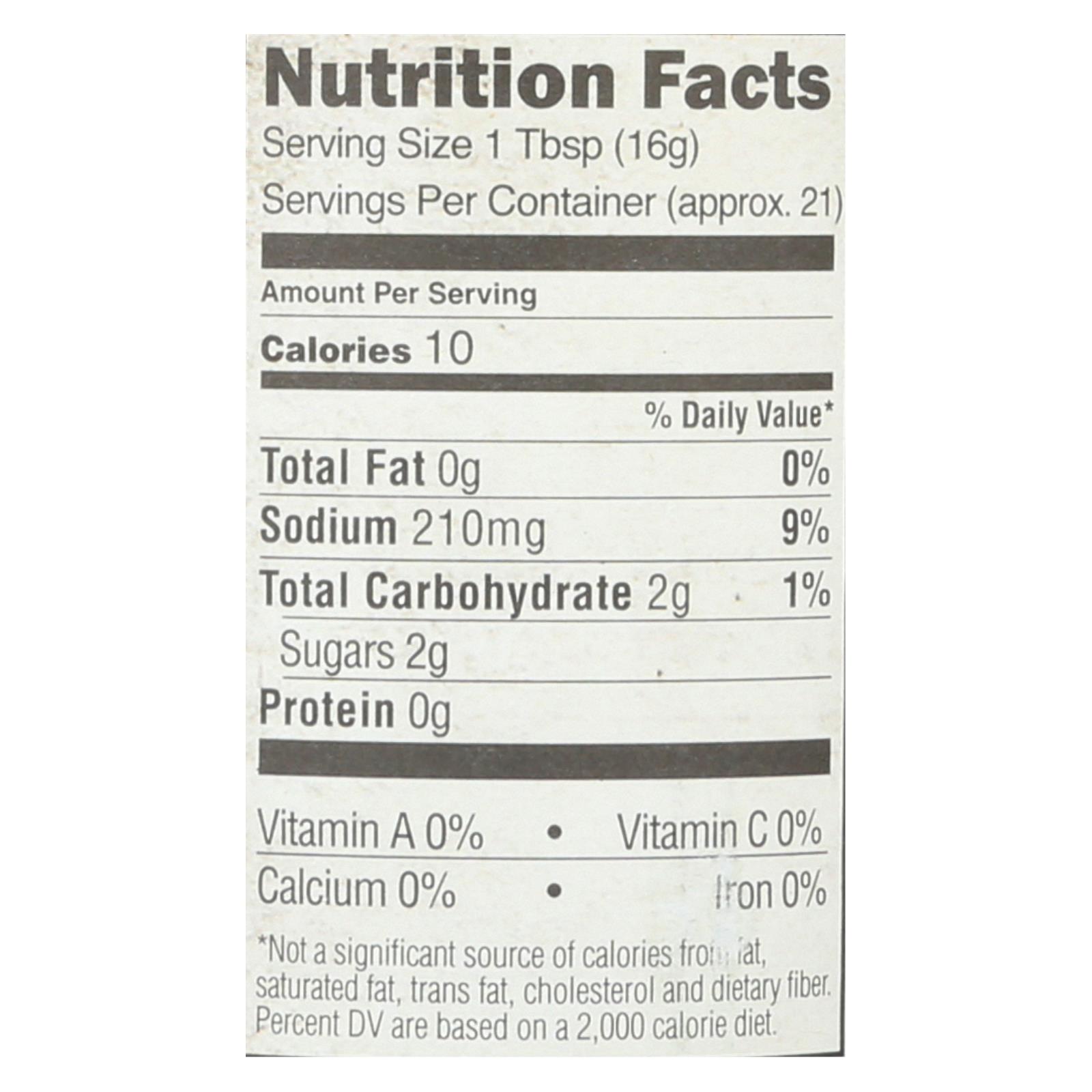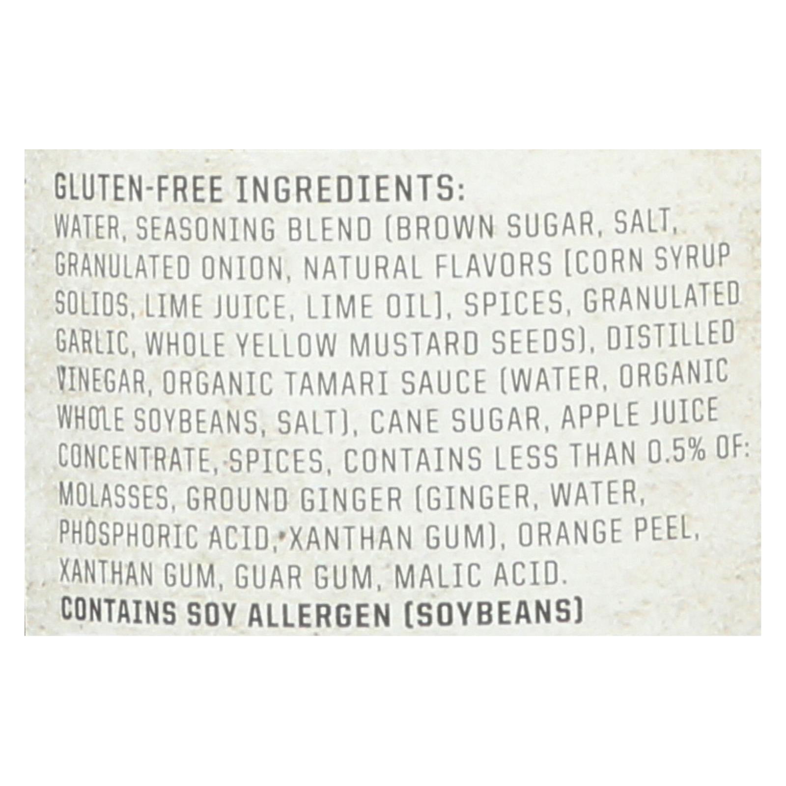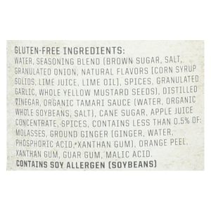 ingredients : water;seasoning blend (brown sugar, salt, granulated onion, natural flavors [corn syrup solids, lime juice, lime oil], spices, granulated garlic, whole yellow mustard seeds);distilled vinegar;organic tamari sauce (water, organic whole soybeans, salt);cane sugar;apple juice concentrate;spices;contains less than 0;5% of: molasses, ground ginger (ginger, water, phosphoric acid, xanthan gum), orange peel, xanthan gum, guar gum, malic acid