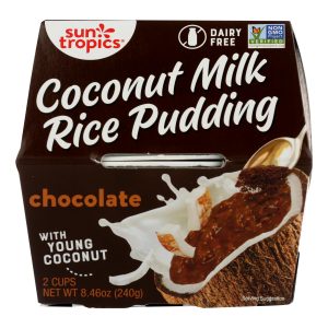 Sun tropics classic cocoa coconut rice pudding is a sweet coconut-based alternative to dairy milk puddings and treats. Each compact 4.33 oz. Cup is a single 140 calorie serving that is ready to eat without preparation. Serve at room temperature, chilled or heated and stir well before serving to reincorporate separated parts for best texture and taste. This 8.46 oz. Package has two servings.