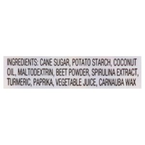 ingredients : cane sugar;potato starch;rice flour;rice bran oil;maltodextrin;beet powder;spirulina extract;turmeric;paprika;vegetable juice;carnauba wax