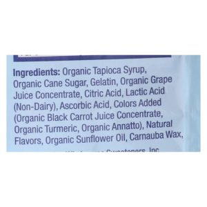 ingredients : organic tapioca syrup;organic cane sugar;gelatin;organic grape juice concentrate;citric acid;lactic acid;non-dairy;ascorbic acid;colors added;organic black carrot juice concentrate;organic turmeric;organic annatto;natural flavors;organic sunflower oil;carnauba wax