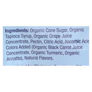 ingredients : organic cane sugar;organic tapioca syrup;organic grape juice concentrate;pectin;citric acid;ascorbic acid;colors added (organic black carrot juice concentrate, organic turmeric, organic annatto);natural flavors