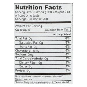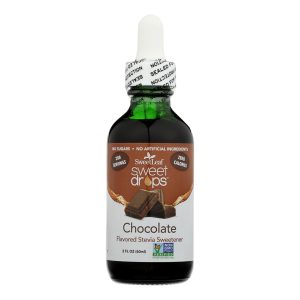 Sweetleaf sweet drops chocolate liquid stevia is the all-natural, zero calories, zero carbs sweetener. With a serving size of only about 5 drops (or to taste) to an 8 oz. Glass, you’ll get as many as 288 servings in this 2 fl. Oz. Bottle. Ingredients include organic stevia leaf extract, purified water, natural flavors and cocoa extract.