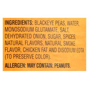 ingredients : blackeye peas;water;monosodium glutamate;salt;dehydrated onion;sugar;spices;natural flavors;natural smoke flavor;chicken fat and disodium edta;to preserve color