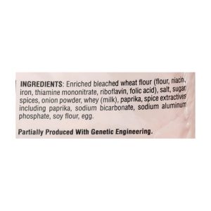 ingredients : enriched bleached wheat flour;flour;niacin;iron;thiamine mononitrate;riboflavin;folic acid;salt;sugar spices;onion powder;whey;milk;paprika;spice extractives including paprika;sodium bicarbonate;sodium aluminum phosphate;soy flour;egg