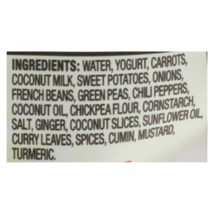 ingredients : water;yogurt;carrots;coconut milk;sweet potatoes;onions;french beans;green peas;chili peppers;coconut oil;chickpea flour;cornstarch;salt;ginger;coconut slices;sunflower oil;curry leaves;spices;cumin;mustard;turmeric