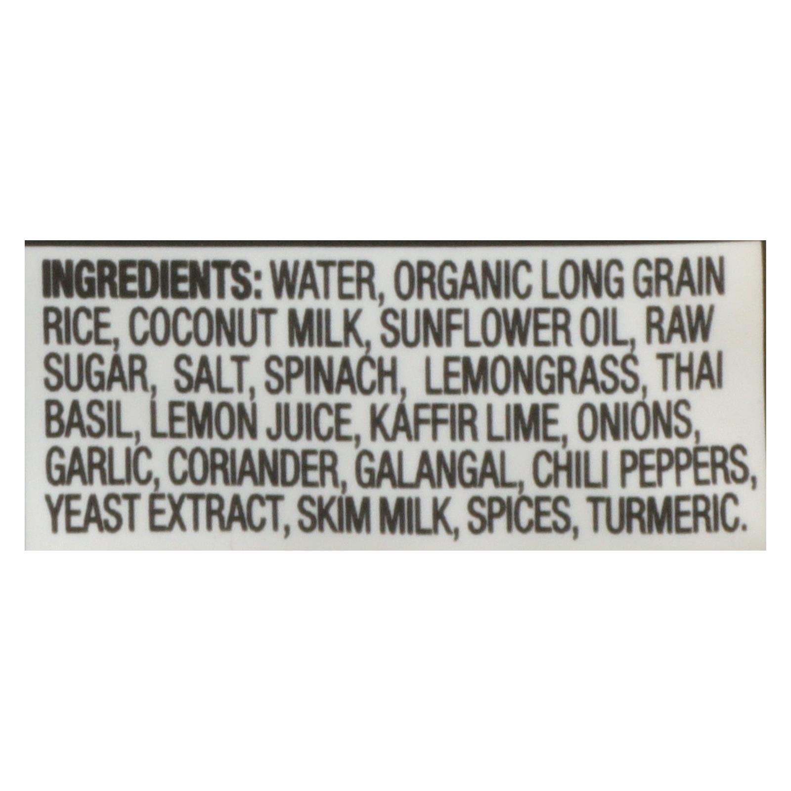 ingredients : water;long grain rice;coconut milk;sunflower oil;spinach;jaggery (brown cane sugar);lemon juice;salt;green chili peppers;natural flavors (coriander, kaffir lime, lemongrass, basil);dried onion;dried garlic;black pepper;cumin;coriander;star anise;turmeric