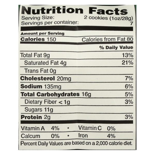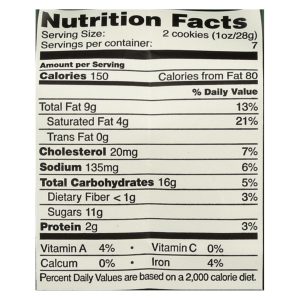 Tate’s bake shop chocolate chip walnut cookies are thin, buttery and crisp cookies made from simple ingredients like semi-sweet chocolate chips, flour, butter, cane sugar, walnuts and eggs. Each 7 oz. Bagged container has 7 two craft-baked cookie servings. Each serving is 150 calories and 0 g. Of trans fat. See nutrition facts panel for allergens.