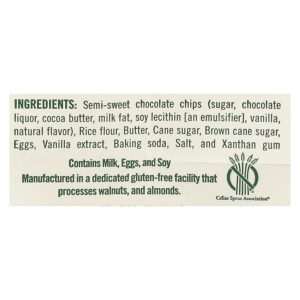ingredients : semi-sweet chocolate chips;sugar;chocolate liquor;cocoa butter;milk fat;soy lecithin [an emulsifier];vanilla;natural flavor;rice flour;butter;cane sugar;brown cane sugar;eggs;vanilla extract;baking soda;salt;and xanthan gum