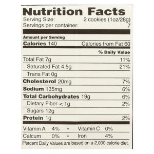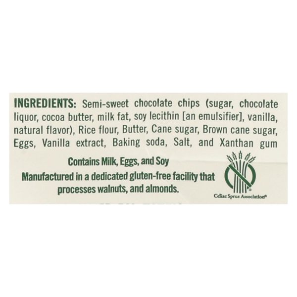 Tate’s bake shop gluten free chocolate chip cookies are thin, buttery and crisp cookies made from simple ingredients like semi-sweet chocolate chips, rice flour, butter, cane sugar and eggs. Each 7 oz. Bagged container has 7 two craft-baked cookie servings. Each serving is 140 calories and 0 g. Of trans fat. See nutrition facts panel for allergens.