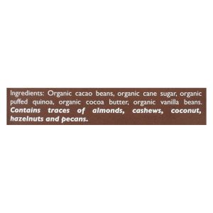 ingredients : organic cacao beans;organic cane sugar;organic puffed quinoa;organic cocoa butter;organic vanilla beans