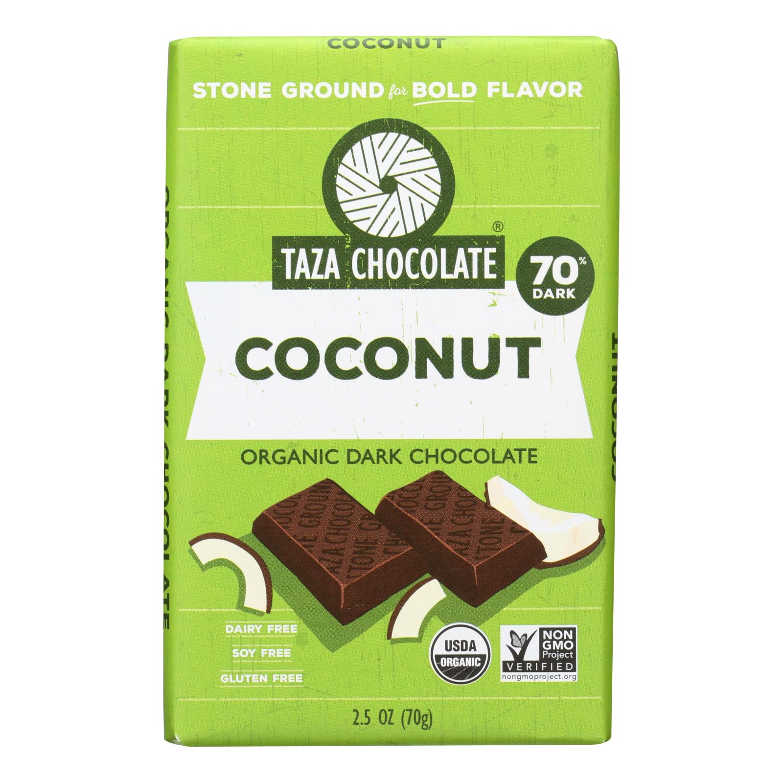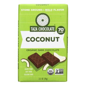 Taza chocolate coco besos coconut 70% dark chocolate bar is usda-certified organic, kosher, non-gmo project verified, vegan and gluten-free. Each 2.5 oz. Bar is made with stone ground chocolate, organic cane sugar and organic coconut in somerville, massachusetts. See nutrition facts panel for allergens.