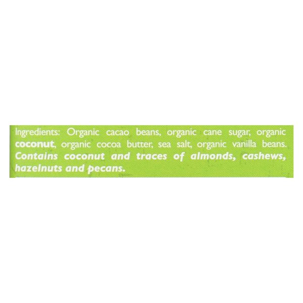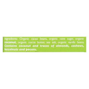 ingredients : organic cacao beans;organic cane sugar;organic coconut;organic cocoa butter;sea salt;organic vanilla beans