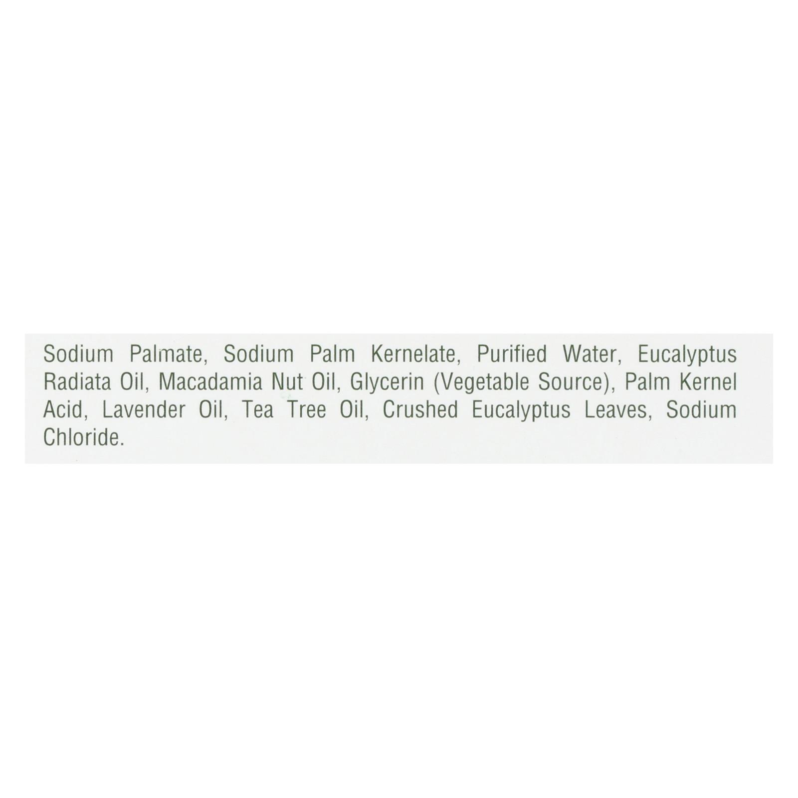 Tea tree therapy eucalyptus soap features anti-microbial banalasta eucalyptus radiata oil along with macadamia nut and lavender oils, vegetable glycerin and crushed eucalyptus leaves, which provide gentle exfoliation. It is formulated for use on all skin types. Every 3.5 oz. Box is made without the use of animal testing and is a product of the u.s.a.