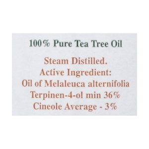 ingredients : active ingredient: oil of melaleuca alternifolia terpinen-4- min 36% cineole average – 3%