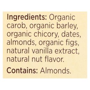 ingredients : organic carob;organic barley;organic chicory;dates;almonds;organic figs;natural vanilla nut flavor;natural vanilla extract