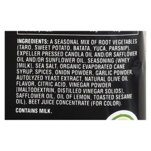 ingredients : a seasonal mix of root vegetables;taro;sweet potato;batata;yuca;parsnip;expeller pressed canola oil and/or safflower oil and/or sunflower oil;seasoning;whey [milk];sea salt;organic evaporated cane syrup;spices;onion powder;garlic powder;autolyzed yeast extract;natural olive oil flavor;citric acid;vinegar powder [maltrodextrin;distilled vinegar solids];safflower oil;oil of lemon;toasted sesame oil;beet juice concentrate;for color
