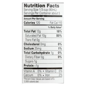 Thai kitchen organic unsweetened coconut milk is made from coconut, water and guar gum and does not contain chemical additives or preservatives. Each 1/3 c. Serving in the 13.66 fl. Oz. Can contains 120 calories, 1 g. Of sugar and less than 1 g. Of protein. Our unsweetened coconut milk is gluten-free, usda-certified organic and vegan.
