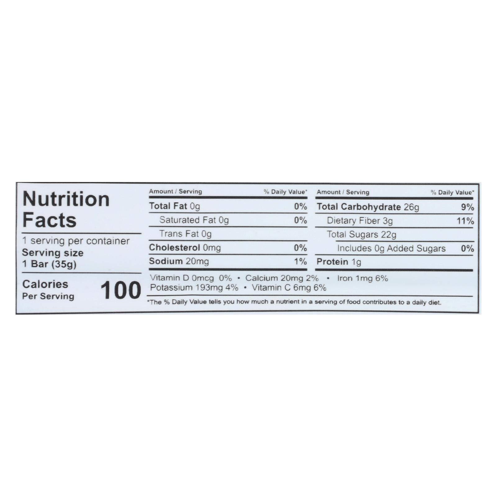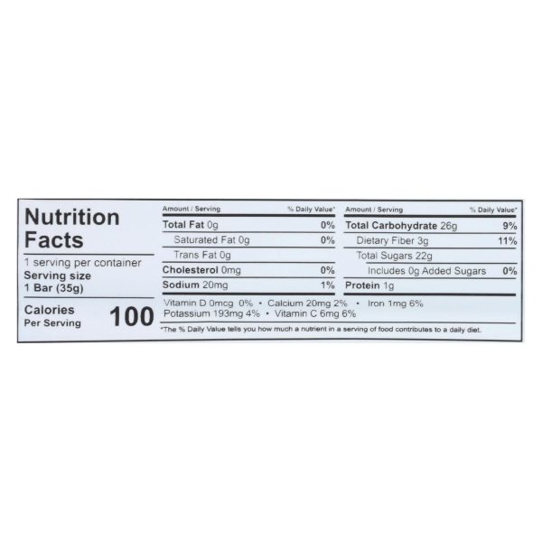 That’s it apple + cherry fruit is all natural and raw, made solely from apples and cherries, with no sugar added. Each 1.2 oz. Bar contains 100 calories, 22 g. Of sugar and 3 g. Of dietary fiber. Our fruit bar is certified gluten-free, kosher-parve, natural food certified and non-gmo project verified.
