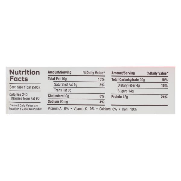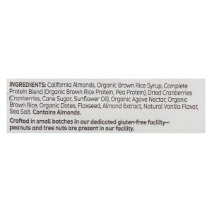 ingredients : california almonds;organic brown rice syrup;complete protein blend (organic brown rice protein, pea protein);dried cranberries (cranberries, cane sugar, sunflower oil);organic agave nectar;organic brown rice;organic dates;flaxseed;almond extract;natural vanilla flavor;sea salt