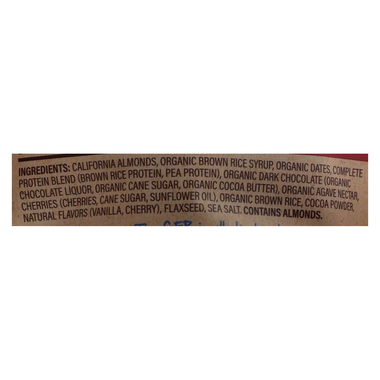 ingredients : california almonds;organic brown rice syrup;organic dates;complete protein blend;organic brown rice protein;pea protein;organic dark chocolate;organic chocolate liquor;organic cane sugar;organic cocoa butter;organic agave nectar;cherries;cane sugar;sunflower oil;organic brown rice;cocoa powder;natural flavors;vanilla;cherry;flaxseed;sea salt