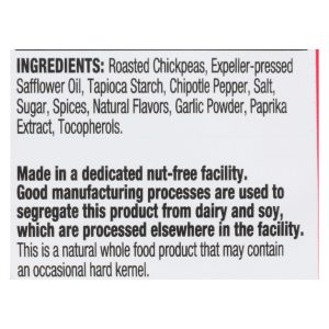 ingredients : roasted chickpeas;expeller-pressed safflower oil;tapioca starch;chipotle pepper;salt;sugar;spices;natural flavor;garlic powder;paprika extract;tocopherols
