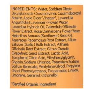 ingredients : water;sorbitan oleate decylglucoside crosspolymer;cocamidopropyl betaine;apple cider vinegar;lavandula angustifolia (lavender) flower water;lavandula hybrida oil;calendula officinalis flower extract;rosa damascena flower water;helianthus annuus (sunflower) seed oil;asparagus racemosus root extract;allium sativum (garlic) bulb extract;althaea officinalis root extract;citrus grandis (grapefruit) seed extract;lactic acid;tocopherol;citric acid;ethylhexylglycerin;glycerin;sodium chloride;potassiums