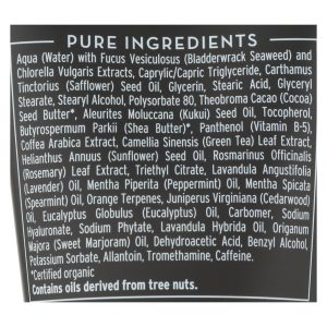 ingredients : aqua;water;with fucus vesiculosus;bladderwrack seaweed;and chlorella vulgaris extracts;caprylic/capric triglyceride;carthamus tinctorius;safflower;seed oil;glycerin;stearic acid;glyceryl stearate;stearyl alcohol;polysorbate 80;theobroma cacao;cocoa;seed butter;aleurites moluccana;kukui;tocopherol;butyrospermum parkii;shea butter;panthenol;vitamin b-5;coffea arabica extract;camellia sinensis;green tea;leaf extract;helianthus annuus;sunflower;rosmarinus officinalis;rosemary;triethyl citrate;lavand