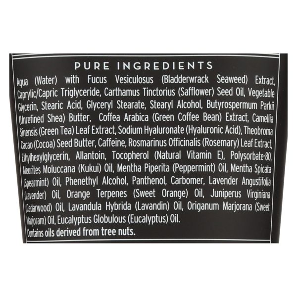 ingredients : aqua;water;with fucus vesiculosus;bladderwrack seaweed;and chlorella vulgaris extracts;caprylic/capric triglyceride;carthamus tinctorius;safflower;seed oil;glycerin;stearic acid;glyceryl stearate;stearyl alcohol;polysorbate 80;theobroma cacao;cocoa;seed butter;aleurites moluccana;kukui;tocopherol;butyrospermum parkii;shea butter;panthenol;vitamin b-5;coffea arabica extract;camellia sinensis;green tea;leaf extract;helianthus annuus;sunflower;rosmarinus officinalis;rosemary;triethyl citrate;lavand