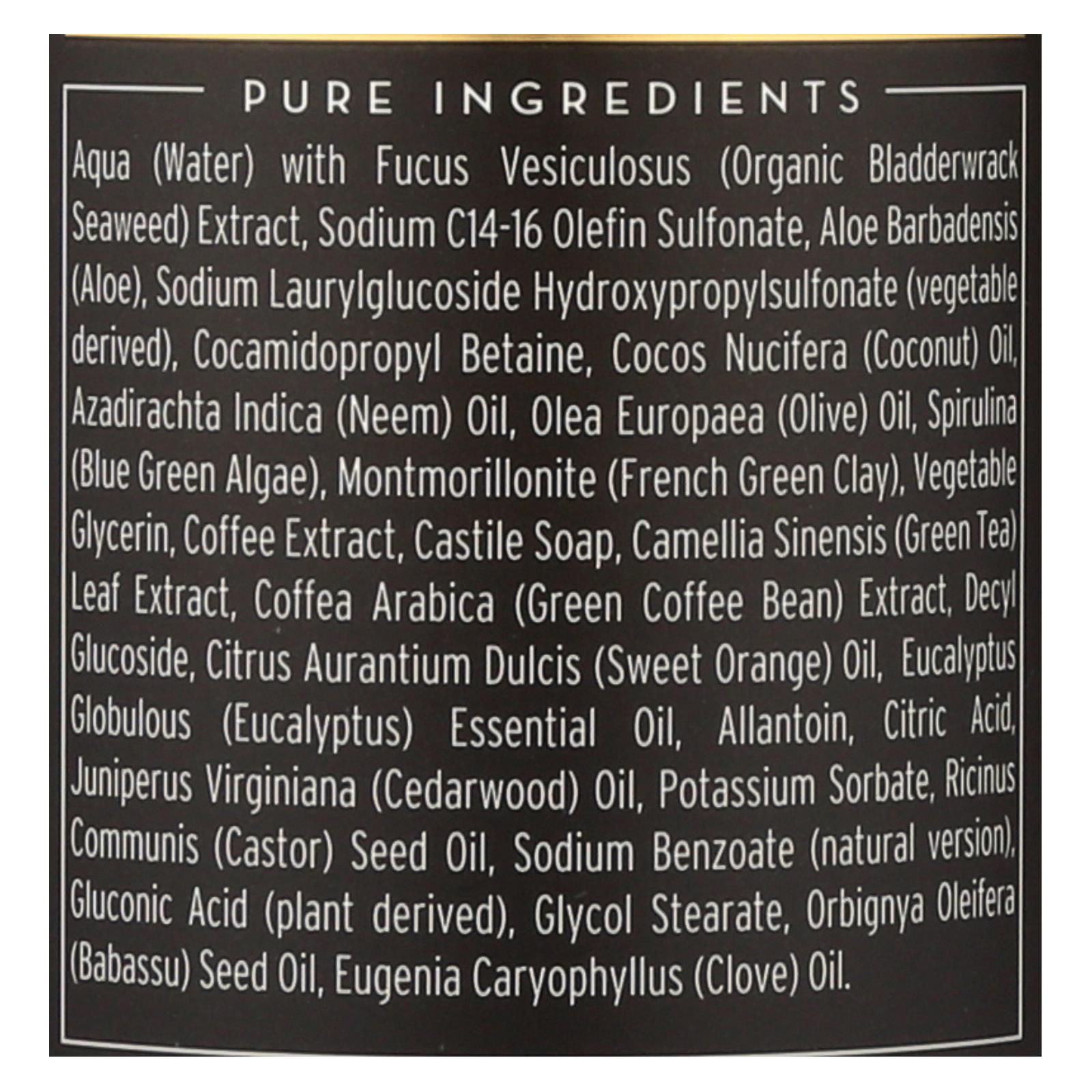 ingredients : aqua;water;with fucus vesiculosus;organic bladderwrack seaweed;extract;sodium c14-16 olefin sulfonate;aloe barbadensis;aloe;sodium laurylglucoside hydroxypropylsulfonate;vegetable derived;cocamidopropyl betaine;cocos nucifera;coconut;oil;azadirachta indica;neem;olea europaea;olive;spirulina;blue green algae;montmorillonite;french green clay;vegetable glycerin;coffee extract;castile soap;camellia sinensis;green tea;leaf extract;coffea arabica;green coffee bean;decyl glucoside;citrus aurantium dul
