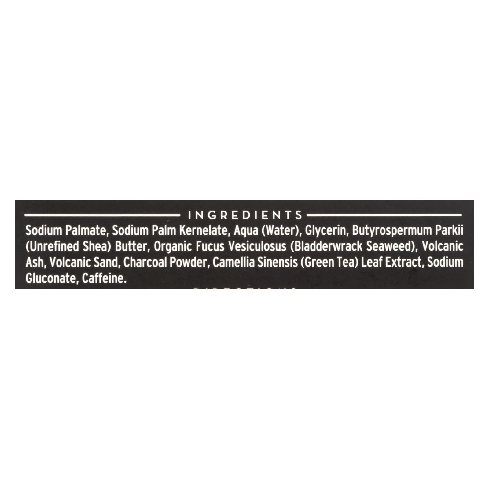 ingredients : sodium palmate;sodium palm kernelate;aqua;water;glycerin;butyrospermum parkii;unrefined shea;butter;organic fucus vesiculosus;bladderwrack seaweed;volcanic ash;volcanic sand;charcoal powder;camellia sinensis;green tea;leaf extract;sodium gluconate;caffeine