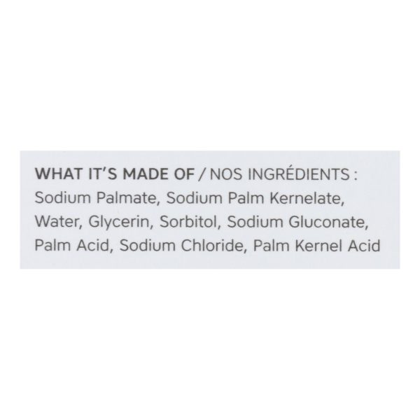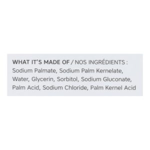 ingredients : sodium palmate;sodium palm kernelate;water;glycerin;sorbitol;sodium gluconate;palm acid;sodium chloride;palm kernel acid