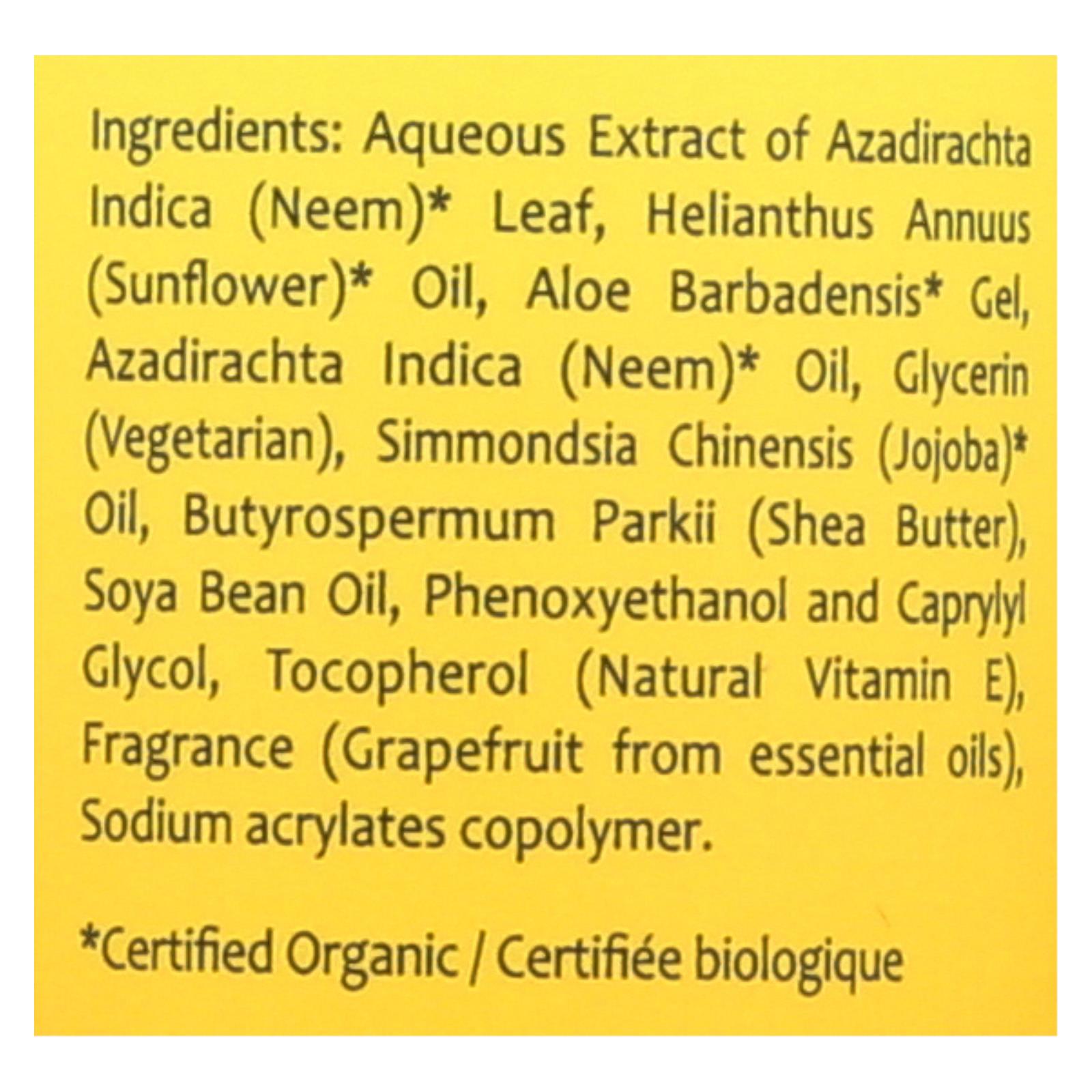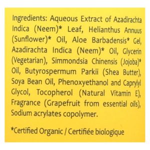 ingredients : aqueous extract of azadirachta indica;neem;leaf;helianthus annuus;sunflower;oil;aloe barbadensis* gel;azadirachta indica;glycerin;vegetarian;simmondsia chinensis;jojoba;butyrospermum parkii;shea butter;soya bean oil;phenoxyethanol and caprylyl glycol;tocopherol;natural vitamin e;fragrance;grapefruit from essential oils;sodium acrylates copolymer