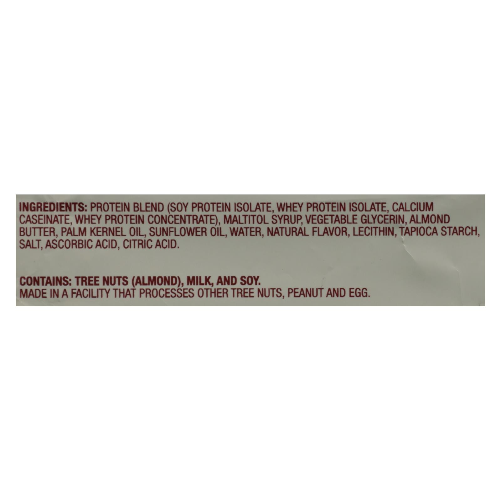 ingredients : protein blend (soy protein isolate, whey protein isolate, calcium caseinate, whey protein concentrate);maltitol syrup;vegetable glycerin;almond butter;palm kernel oil;sunflower oil;water;natural flavor;lecithin;tapioca starch;salt;ascorbic acid;citric acid