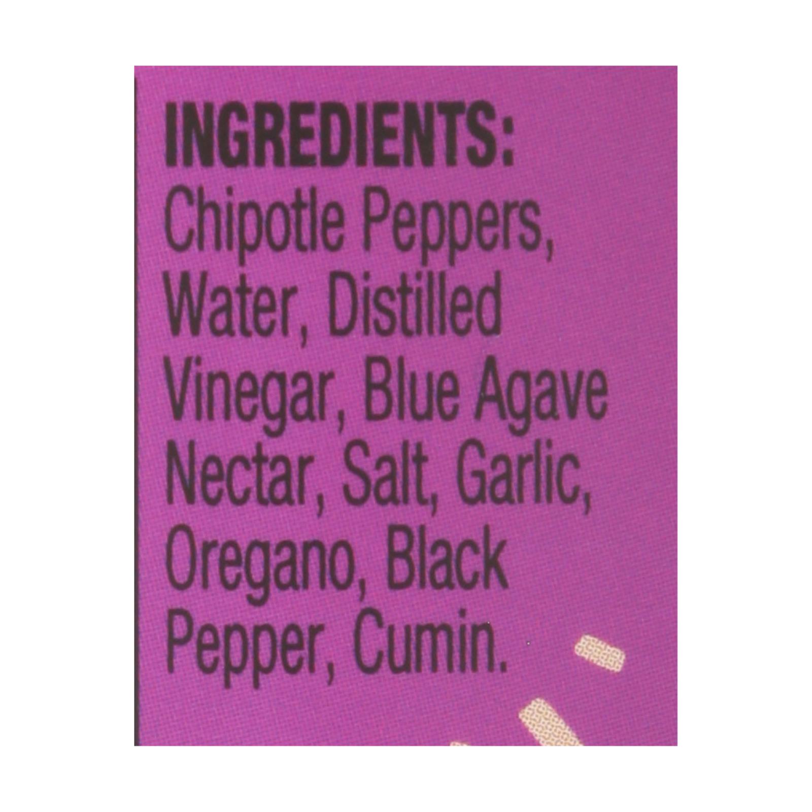 ingredients : chipotle peppers;water;distilled vinegar;blue agave nectar;salt;garlic;oregano;black pepper;cumin
