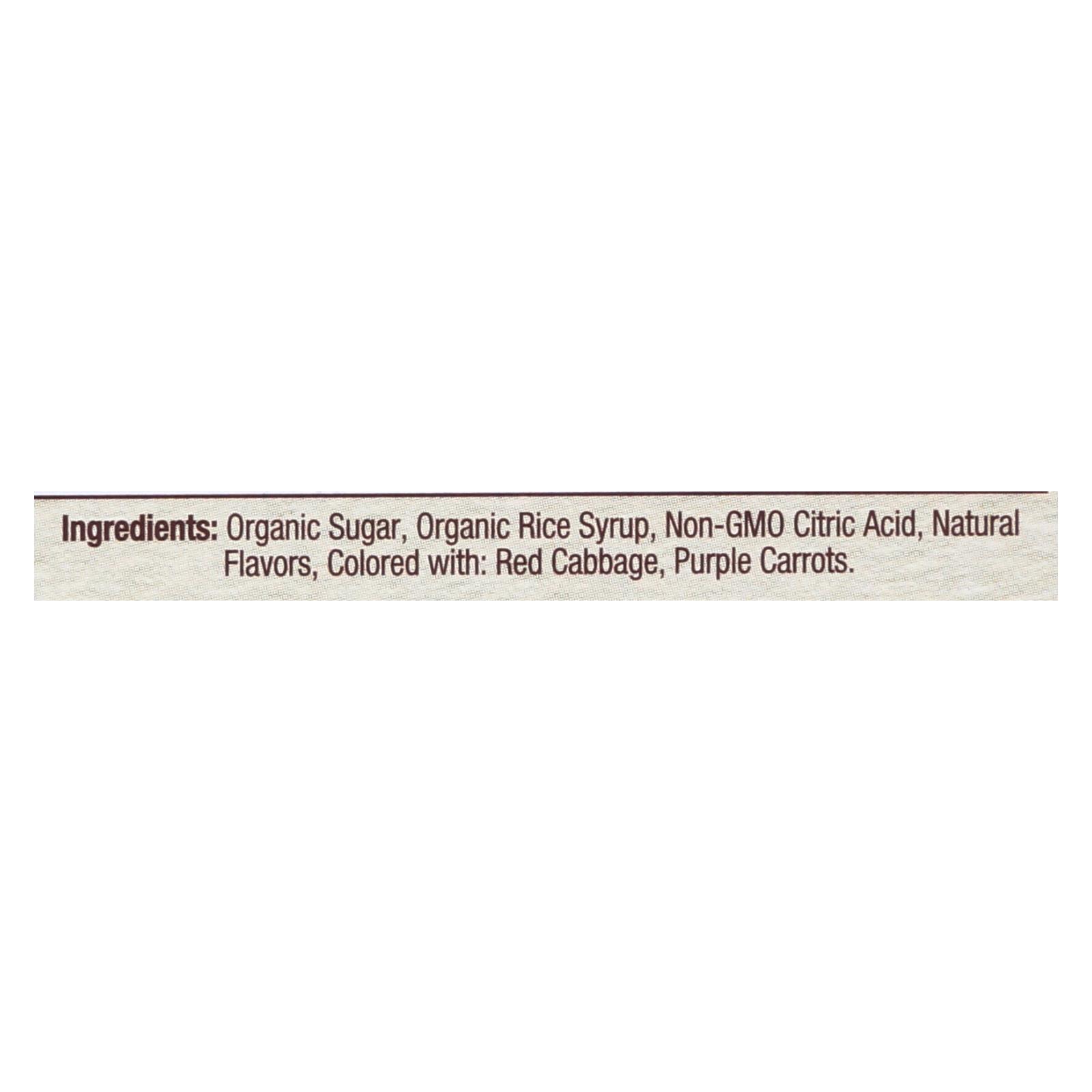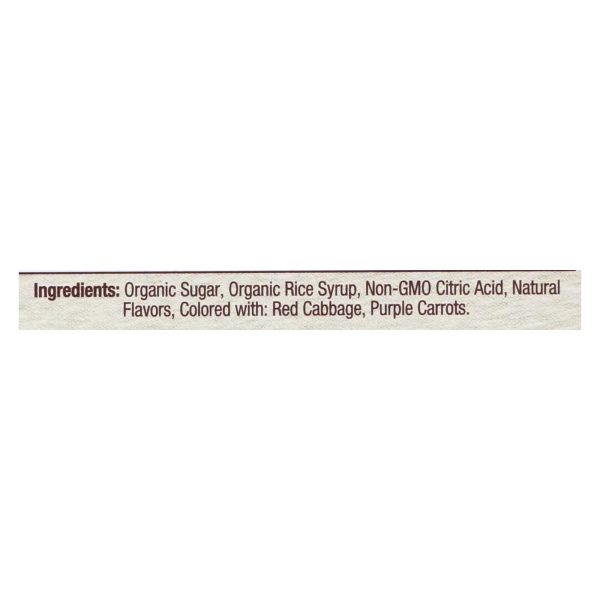 ingredients : organic sugar;organic rice syrup;non-gmo citric acid;natural flavors;colored with: red cabbage, purple carrots