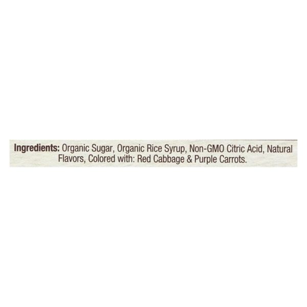 ingredients : organic sugar;organic rice syrup;non-gmo citric acid;natural flavors;colored with: red cabbage & purple carrots
