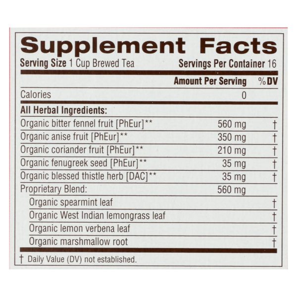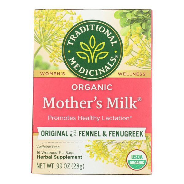 Traditional medicinals’ mother’s milk bagged tea is made with certified usda organic and verified non-gmo ingredients. Each box contains 16 tea bags of our naturally caffeine free herbal tea. Ingredients like bitter fennel fruit, anise fruit, fenugreek seed and blessed thistle herb support healthy lactation. See label for warnings and risks.